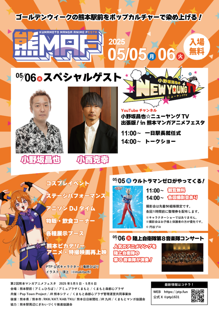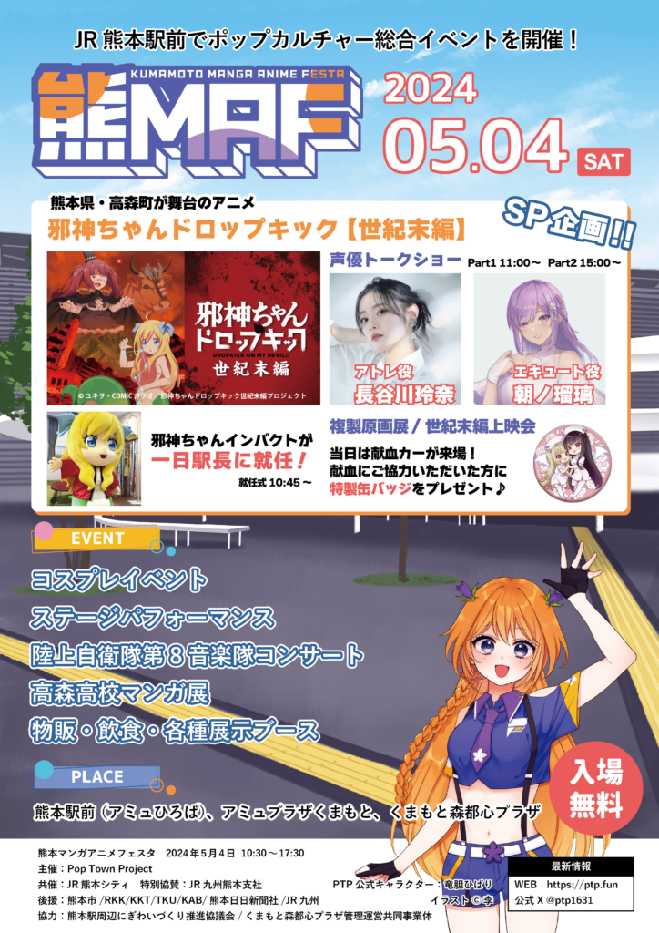 地元企業様をはじめとする多くの方々のご協力のもと、ポップカルチャーによる地域活性化を目指す団体Pop Town Project(ポップタウンプロジェクト)が、JR熊本シティ、くまもと森都心プラザ管理運営共同企業体と共催しています。